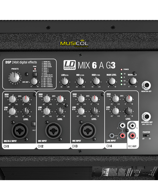 הבחירה האידיאלית עבור הגברה קטנה. ה – LD MIX 6 G3 הוא רמקול מוגבר המשלב מיקסר 4 ערוצים ומגבר דיגיטלי בהספק של פעמיים 280W. בס רפלקס קומפקטי שכולל וופר מותאם אישית בגודל “6.5 וטויטר “1, עם תגובת תדרים מדהימה לגודלו הקטן מ- 80Hz ועד 20Khz וזוית פיזור אולטימטיבית 80°X70° המספק צליל צלול ופאנץ חזק. המיקסר המובנה מכיל מגוון רחב של כניסות של מכשירים חשמליים, סמארטפון, טאבלטים, נגני MP3 וקומפקטדיסק. 3 ערוצי מיקרופון בחיבור קומבו XLR/PL וערוץ סטריאו ליין בחיבור RCA/PL עם אקולייזר 2 ערוצים (LOW+HI) לכל ערוץ. פאנטום +15V. היציאה כוללת ווליום מאסטר ו-3 ערוצי אקולייזר (LOW+MID+HI). בנוסף מולטי אפקט DPS עם 16 אפקטים מובנים. למגבר הגנות מפני עומס יתר, זרם יתר, קצר חשמלי והגנה טרמית. בנוסף לרמקול יציאה מוגברת של 280W לרמקול נוסף ( פאסיבי ) ארגז הרמקול בנוי מעץ MDF קשיח שכולל שני תושבות לסטנד רמקול שניתן לכיוון אופקי או אנכי. ה -LD MIX 6 G3 מספק ביצועים מדהימים ורב גוניים באריזה קלת משקל וניידת בקלות.
