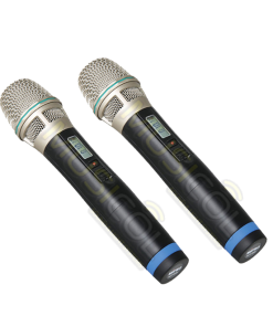 2 מיקרופונים אלחוטיים ידניים עשויים מגוף יציקת פלסטיק מחוזק, מסך LCD המציג את הגרופ וערוץ התדר בו הו נמצא ומצב סוללה קפסולה דינמית, משדר בעוצמה של 30Mw בגוף המיקרופון מתג הפעלה עם מסנן רעשים בהדלקה וכיבוי, פועל עם 2 סוללות 1.5V AA מגיע עם מספר טבעות צבע להבדלה בין מיקרופונים אחרים.