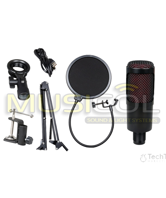 ערכת אולפן משתלמת ביותר להקלטות, לאולפן, לשידורי רדיו מהבית שכוללת מיקרופון קונדנסר אולפני בחיבור USB ישירות למחשב (כבל כלול), סטנד מיקרופון זרוע שדרים עם מהדק להרכבה קלה על כל משטח ופופ סילטר לסינון צלילים פלוסיביים כמו ש’, פ’, צ’.