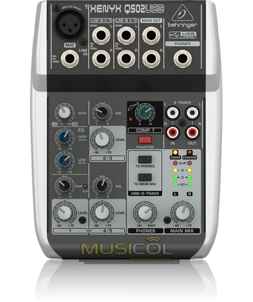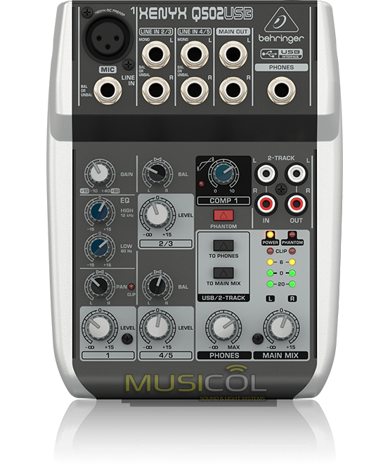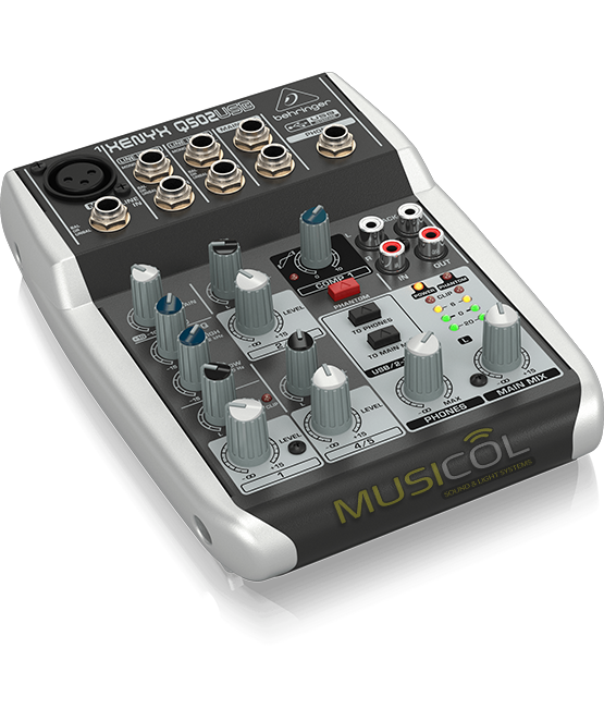ה- Q502USB הינו מיקסר 5 כניסות קומפקטי במיוחד אידיאלי להגברות קטנות והקלטות באולפן הביתי שכולל כניסת מיקרופון עם קדם מגבר מיקרופונים XENYX הכולל מתח פנטום למיקרופוני קונדנסר, קומפרסור נוח לשימוש לשליטה בדינמיקת המיקרופון. 2 כניסות ליין סטריאופוניות. לערוץ המיקרופון יש EQ שכולל ווסתי תדרים (נמוכים וגבוהים) להתאמת הסאונד בצורה האופטימלית. יציאות המוניטורים ויציאת האוניות שיספקו ניטור ללא הגבלה ובאיכות גבוהה, ברוחב פס השמתרע מתחת ל 10kz ומעל 20KHz, פיידרים עגולים לשליטה על העוצמות. מה שהופך אותו למיקסר רב-תכליתי להפליא שמספק גם את הכלים החדישים ביותר כדי לבצע הקלטות מדהימות ואיכותיות. יחד עם כרטיס קול המובנה שלו לחיבור דו כיווני ישיר למחשב ותאום למערכות הפעלה Windows / MAc דרך יציאת USB ברזולוציה של 16Bit/48KHz סטריאו להקלטה, השמעה וכולל חבילת תוכנות להקלטה, עריכה ואפקטים.