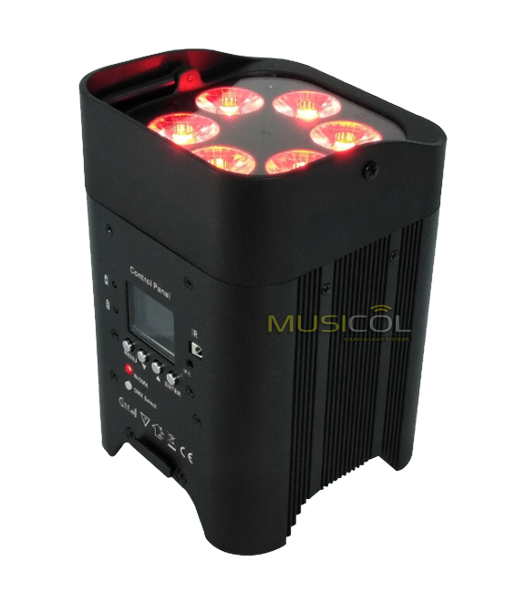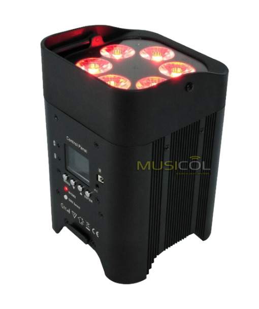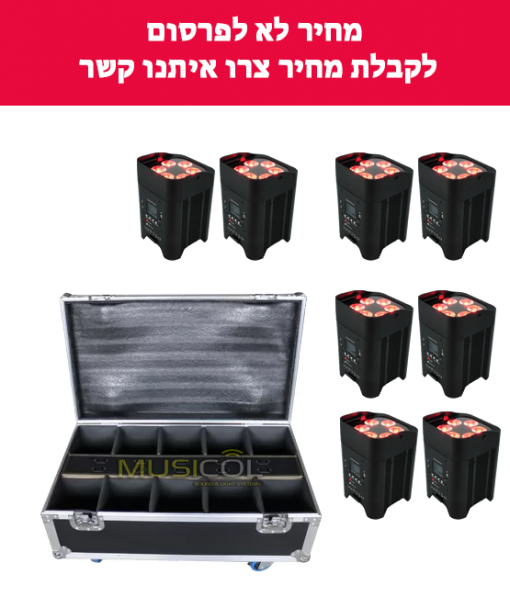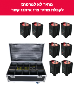 הסט שכולל 8 פנסי לד נטענים כשלכל פנס 6 לדים 6IN1 (אדום, ירוק, כחול, לבן, אמבר ואולטרה) בעוצמה של 12W כל לד, הפנס יכול לעבוד באמצעות סוללה פנימית עד 20 שעות ,והטעינה מתבצעת ע”י חיבור הפנסים למערכת ההטענה במארז הנשיאה אשר טוען את כל הפנסים באמצעות חיבור יעודי לטעינה במתח חשמל V220. לכל פנס מקלט DMX אלחוטי לשליטה אלחוטית דרך פיקוד תאורה סטנדרטי ללא צורך בפריסת כבלים (בתוספת דונגל משדר DMX), כמו-כן מגיע עם שלט אלחוטי IR ללא צורך בפיקוד תאורה, או ניתן להפעילו ידנית באמצעות מסך התצוגה ולחצני ניווט בין התפריטים השונים שכוללים בחירת צבע או מספר צבעים (מיקס בין צבעים) ועוצמת כל צבע, תוכניות מובנות להחלפת צבעים, מחליף צבעים אוטומטי או לפי מוסיקה. התחתית הפנס ישנה תושבת מתכווננת לשינוי זוית העמדת הפנס לכיוון אופטימלי. מארז הנשיאה כולל 4 גלגלים כששני גלגלים עם מעצורים, חיבור חשמל לצורך הטענה עם מפסק לכיבוי והפעלת הטעינה, תאים מופרדים לכל פנס כולל ציפוי ספוג לשמירה מירבית על הפנסים בהובלה.