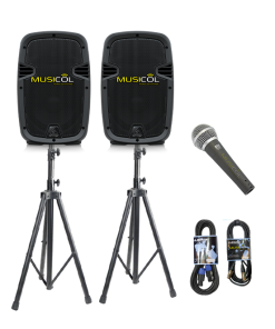 הערכה שכוללת זוג רמקולים “15 בהספק של 1000W עם בלוטוס, כשרמקול אחד מוגבר והשני פסיבי שניזון מהמוגבר, 2 סטנדים לרמקול, מיקרופון דינמי במתנה וכבלים