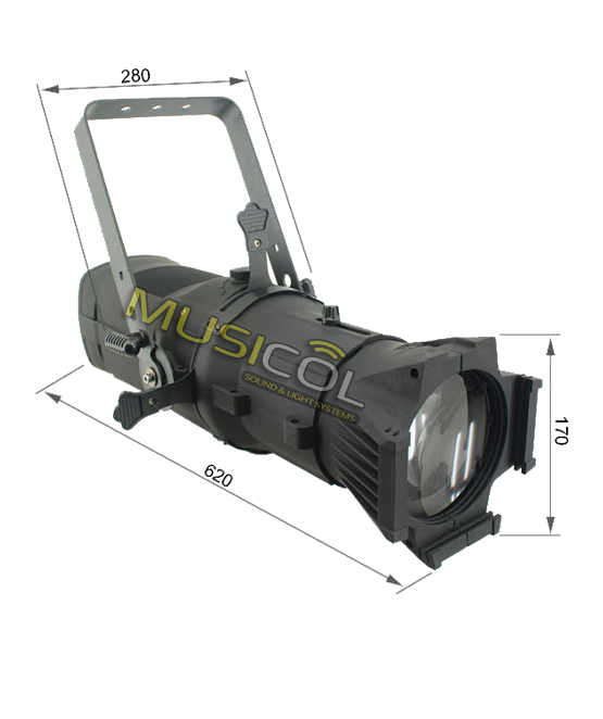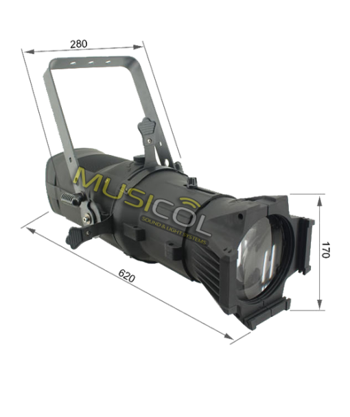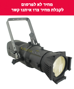 פנס ליקו LED PROFILE SPOT בהספק של 200W נורת לד תוצרת EDISON גוון אור לבן חם עם עדשה 36 מעלות ( הניתן להחלפה ב- 19 ,26 מעלות), 90CRI עם 4 תריסים מתכווננים ידנית, תושבת להוספת גובו, מופעל באמצעות DMX ב-3 ערוצים וכולל דימר לינארי מדוייק 0-100%, מסך תצוגה LCD ולחצני ניווט.