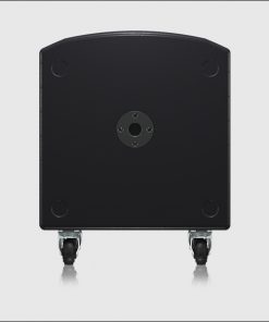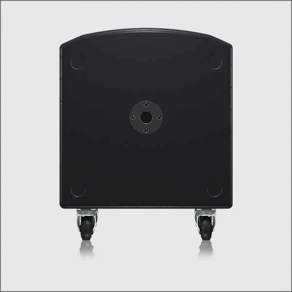 The birch plywood enclosure is fi nished in a hard wearing semi matt black paint and fi tted with a rugged powder coated perforated steel mesh grille, 35 mm pole mount to support a satellite speaker, and plated steel castors with rubber tyres. Mains power input and link output is provided via Neutrik powerCON* connectors.