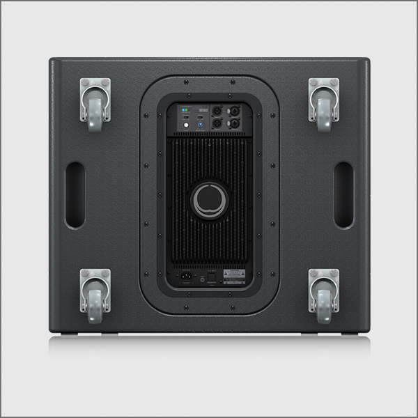The M18B’s enclosure consists of solid birch plywood with a hard wearing semi matt black paint finish, and is ribbed internally to eliminate resonances and to minimize vibration. Plated steel castors with rubber tyres are provided for easy transport, and the standard pole-mount socket allows powered loudspeakers to be mounted, either vertically or raised higher and angled down to optimise audience coverage. Mains power is connected via a non-locking IEC socket with integrated fuseholder. The illuminated front badge can be operated in one of three modes: permanently on; permanently off ; or to indicate the action of limiting.