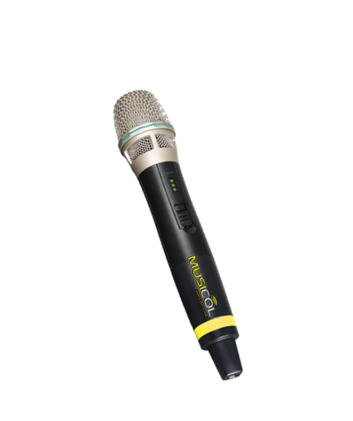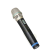 מיקרופון אלחוטי ידני עשוי מגוף יציקת פלסטיק מחוזק, קפסולה קינדנסר עם רגישות של 0db, משדר בעוצמה של 20Mw בגוף המיקרופון מתג הפעלה ו-3 לדים לאינדיקצית מצב סוללה, פועל עם 2 סוללות 1.5V AA מגיע עם מספר טבעות צבע להבדלה בין מיקרופונים אחרים